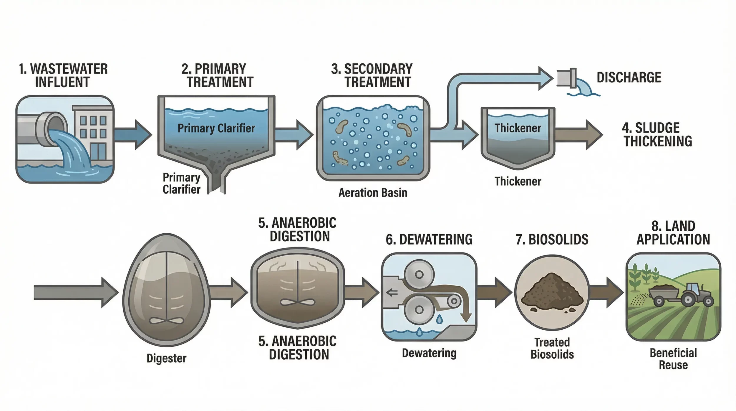 Biosolids are a byproduct of the standard wastewater treatment sequence: