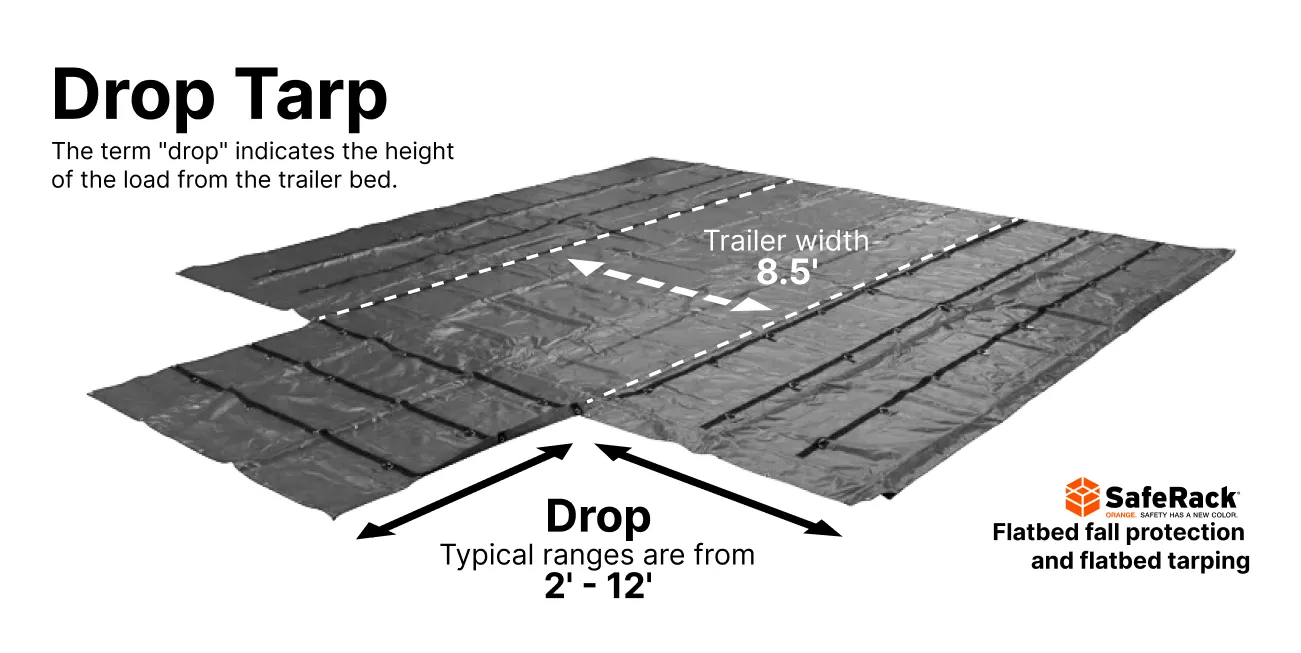 A tarp drop refers to a type of tarp used in the trucking industry to cover loads on flatbed trailers. The term “drop” indicates the height of the load from the trailer bed to the top. For instance, if a load is 6 feet high and 8 feet wide, it has an 6-foot drop on each side. To fully tarp load on the flatbed trailer, the tarp needs to be at least 20 feet wide. Drop tarps typically range from 20 to 24 feet in length and come in various drop sizes, including 4, 6, and 8 feet. They feature hanging flaps on each side that match the length of the drop. For example, a 6-foot drop tarp will have 6-foot hanging flaps.