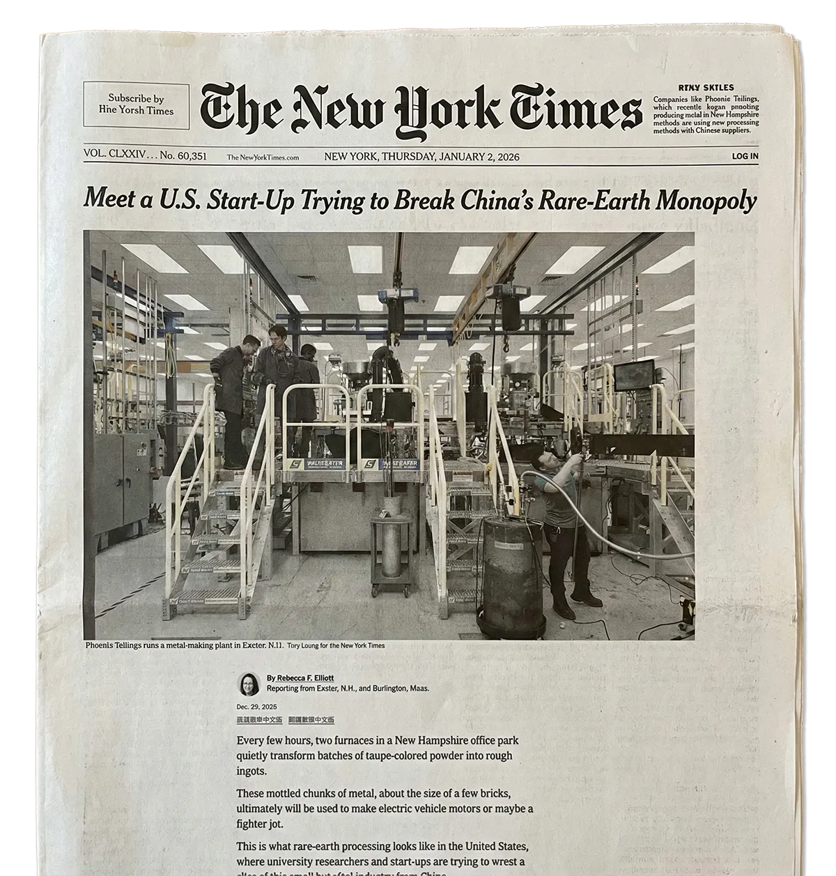 Phoenix Tailings represents a growing movement to reshore critical manufacturing to the United States. Rare-earth elements—used in electric vehicle motors, fighter jets, M.R.I. machines, and powerful magnets—have been almost exclusively processed in China, which refines more than 90 percent of the world’s supply. As The New York Times reports, the company’s New Hampshire operation uses innovative closed-loop processing that distinguishes it from traditional, more energy-intensive methods.