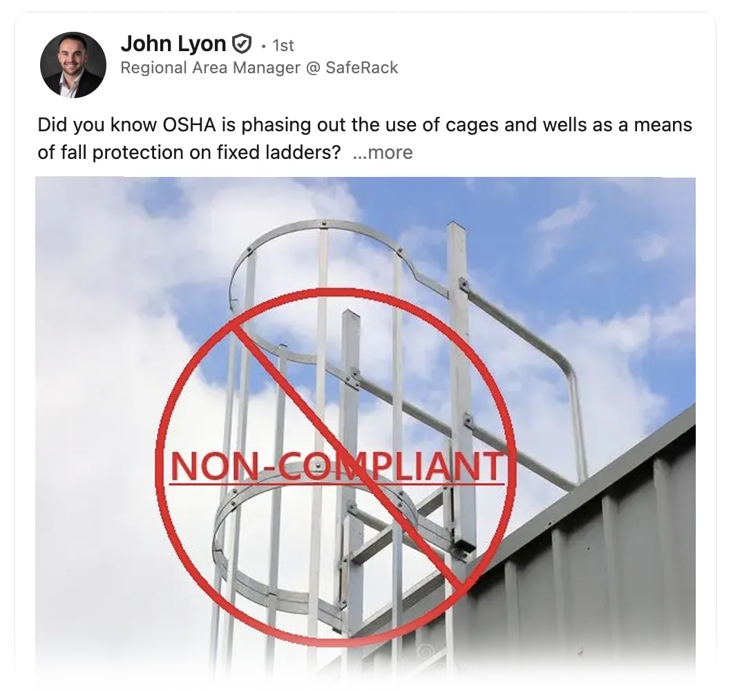 | “All caged ladders are now non-compliant?” | Cages are still legal on older ladders until 2036 or until a major repair is needed. |